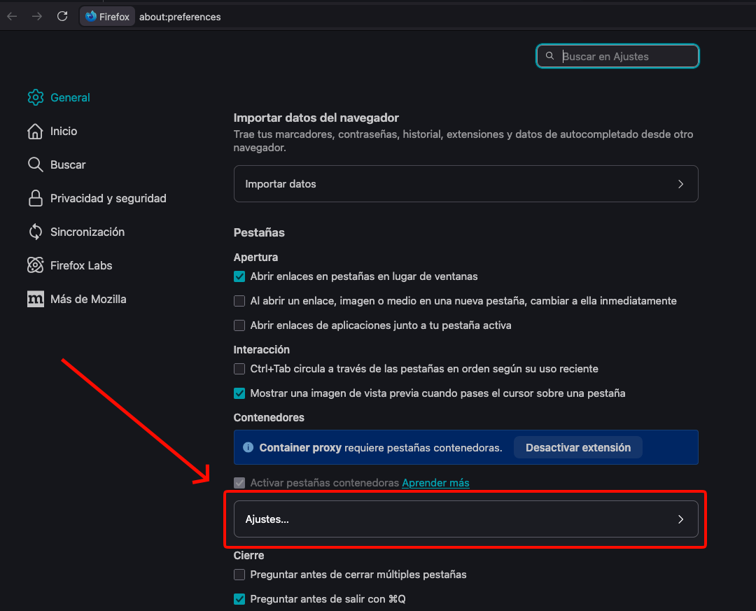 Tras la instalación de la extensión, nos dirigimos a las configuración del navegador y, posteriormente, a la sección de configuración de contenedores.