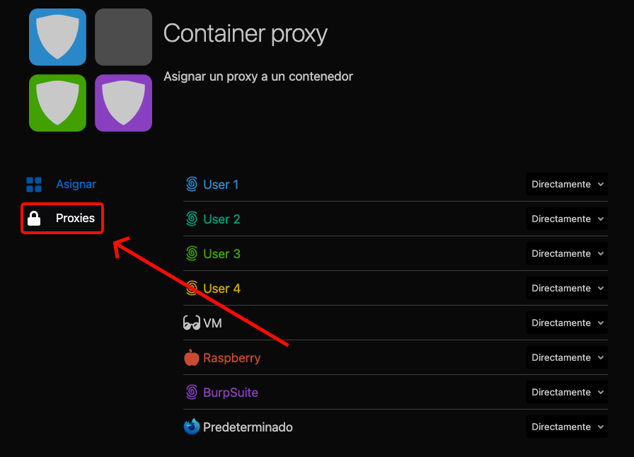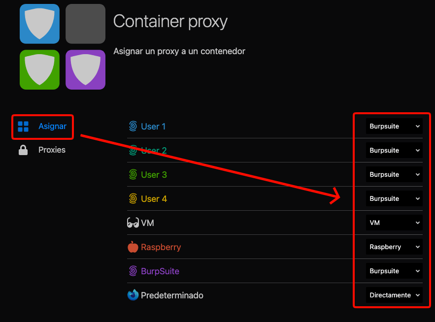 Continuamos a la pestaña “Asignar” y asignamos un proxy a cada contenedor. En este contexto, nos centraremos únicamente en aquellos etiquetados como “User”, ya que los demás son elementos internos utilizados para mis propósitos personales.