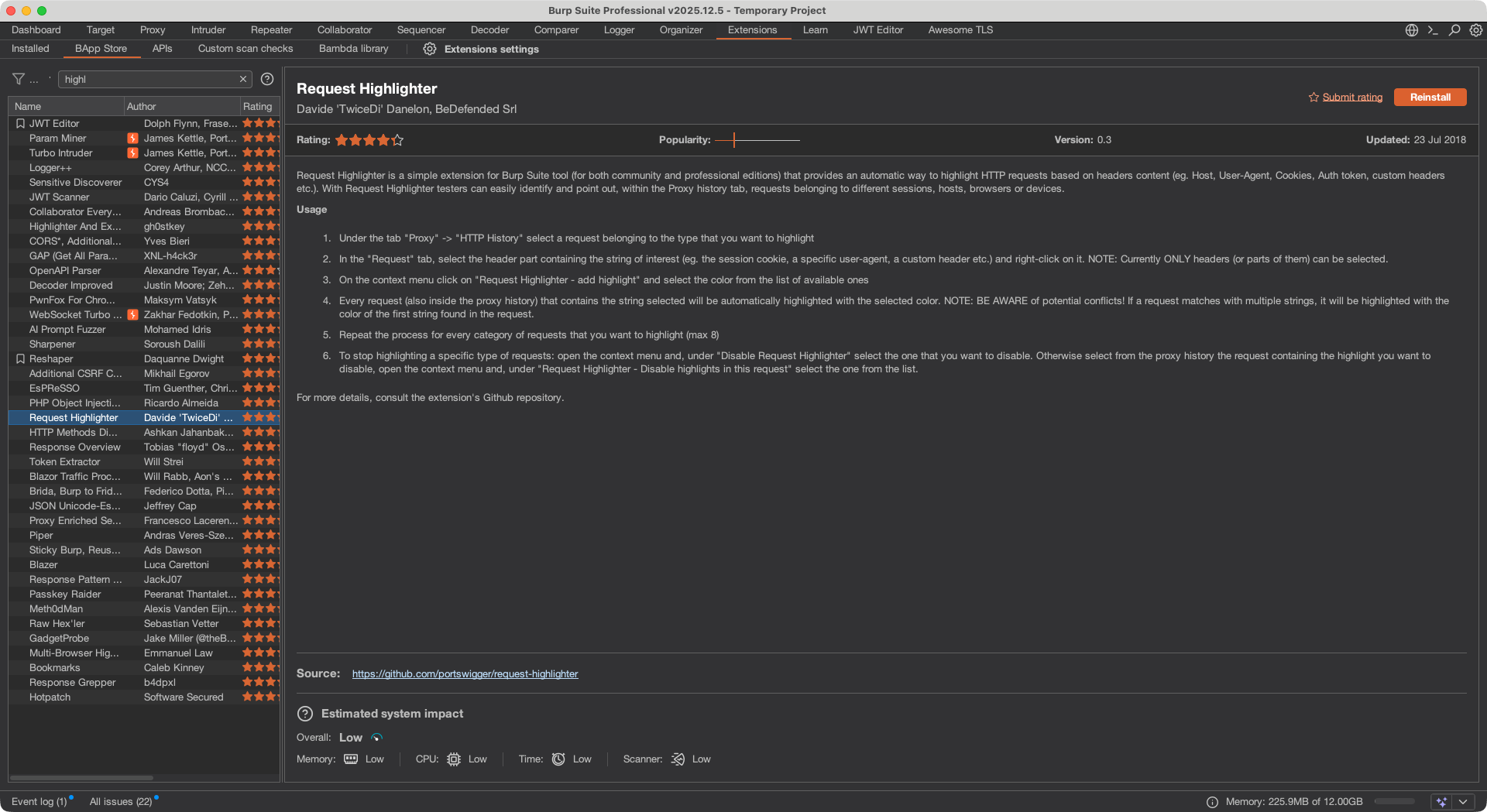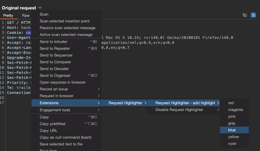 Como complemento, es posible asignar manualmente un color distintivo a cada contenedor en Burp Suite, lo que facilita la diferenciación entre las solicitudes provenientes de distintos contenedores o sesiones. Para ello, se utilizará el plugin “Request Highlighter” de Burp Suite, disponible para descarga en la BApp Store.